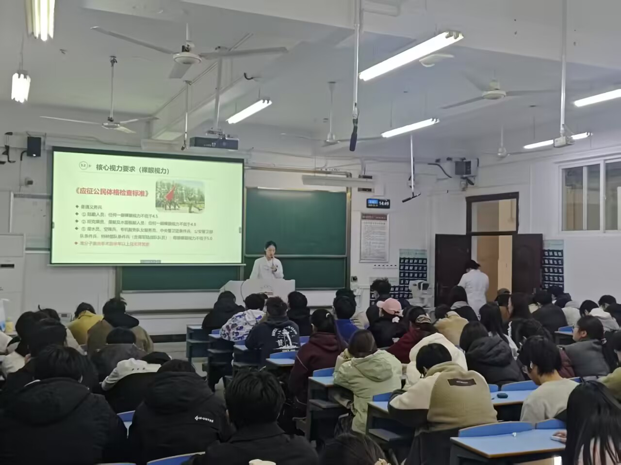 讲座中,刘丹医生详细讲解了近视等常见眼病的成因与危害,列举了不良用眼习惯,并重点阐述了高度近视可能引发的系列并发症,深刻揭示了视力健康的重要性。为帮助同学们直观了解自身眼睛状况,现场引导同学们进行眼睛亚健康自测。并针对员工群体中普遍的视力问题,提供了包括饮食调整、规范做眼保健操在内的实用护眼攻略,还就激光手术矫正视力等话题进行了专业说明。讲座结束后,医疗团队还为同学们提供了免费的视力检测服务,大家踊跃参与,气氛热烈。