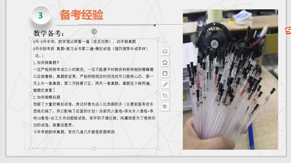 交流会上,葛文毅、倪显虎、章猛三位同学从不同的角度分享了自己的考研经历,虽然讲述侧重点有所不同,但他们真诚朴实的话语给同学们留下了深刻的印象,他们一致认为:正确的方法、不懈的努力、良好的心态是考研成功的三大要素。考入河海大学的章猛重点介绍了考研复习的时间安排和课程复习的重难点,使同学们深刻认识到考研是一场持久战,需要脚踏实地的态度和持之以恒的毅力。考取广州大学的葛文毅详细地介绍了自己如何从选择专业院校、复习计划、心态调节以及科技创新实践实训等方面的亲身经历,同时还根据已有的经验推荐了几个考研院校,帮助同学们再次认识到考研要一步一个脚印,稳扎稳打的坚持下去。最后,考取安徽大学的倪显虎分享了他复试的准备经历,帮助同学们认识到目前阶段做好笔记复习的重要性,正确理解笔试与复试之间的关系,引导在线同学要提前做好准备,认识到机会的把握与充足准备之间的关系。