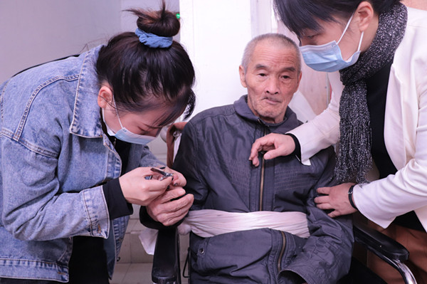 志愿者周丝雨细致地观察到旁边一位坐在轮椅上的老人的指甲有些长,便拿来指甲剪小心翼翼地帮老人剪起了指甲,在了解到老人是患了海默尔综合征,长时间都要坐在轮椅上后,主动帮老人做起了按摩。按摩过程中,老人一直注视着志愿者,神情也逐渐放松。