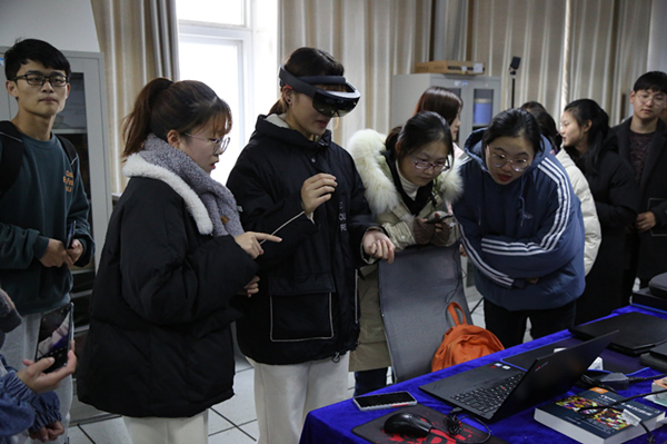 活动过程中,同学们每到一个展台,相关展台的负责人员都会对所展示的设备和技术进行详细的讲解并协助参观的同学进行设备的体验。同学们兴致勃勃,体验了VR头盔、VR一体机、混合现实头盔和深度相机等先进设备,游玩了实验室同学开发的敬敷书院、黄梅戏博物馆等虚拟场景以及体感切水果游戏等新型游戏交互技术。