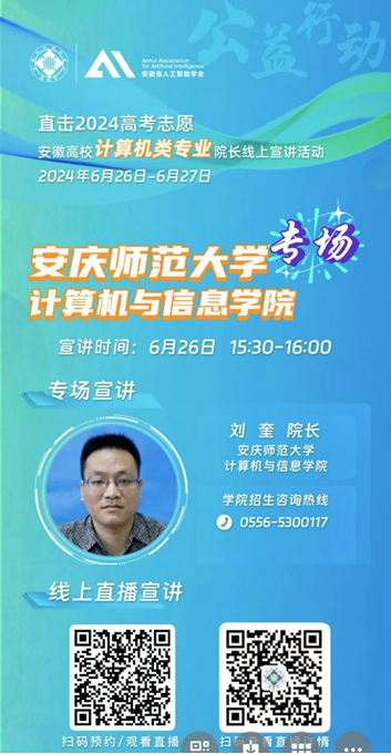 太阳集团tyc539受邀参加由安徽省计算机学会、安徽省人工智能学会共同主办的“直击2024高考志愿——安徽高校计算机类专业经理线上宣讲活动”,云端宣讲,专业招生,线上与广大考生和家长交流互动。