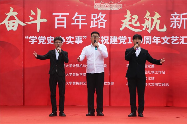 婉转悠扬的竹笛独奏、明快的黄梅戏联唱、饱含深情气势磅礴的红色歌曲的合唱或独唱……6月19日下午安庆市花亭北村社居委广场热闹非凡,由公司太阳集团tyc539、音乐公司与黄梅剧艺术公司师生组成的文化惠民志愿服务队开展的“学党史 办实事”庆祝建党100周年文艺汇演正在此进行。计算机与信息公司党委书记陈银凤、音乐公司党委副书记肖之进及公司师生志愿者与社区干部群众百余人共同观看了此次演出。