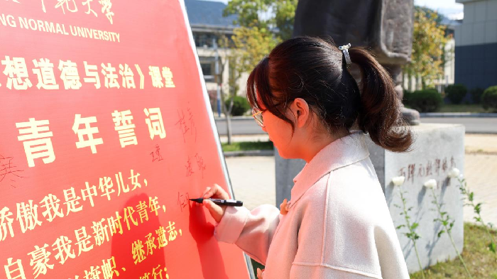 891个字,72行诗,4页稿纸,讲述着邓稼先的一生……一首由2021级“邓稼先”班的刘琪同学原创的诗歌《追寻》被4名朗诵者现场朗诵。从涉洋学成毅然归国,到为创国之利器隐姓埋名28载,到只身一人深入核试验“危险区”,再到临终前仍心系家国天下,伴随着朗诵,“稼先青年”们走过了邓老的一生。“我骄傲我是中华儿女,我自豪我是新时代青年……”在宣誓后,全体同学在雕像旁的《青年誓词》誓词板上签下了自己的姓名。“无论我们来自哪里,叫什么名字,我们站在这里,身为稼先班的一员,我们就是‘稼先青年’。该班梁志超同学表示,在誓词板上“有了姓名”,也意味着在祖国未来的事业建设中也要“有姓有名”,将稼先精神不断发扬光大。
