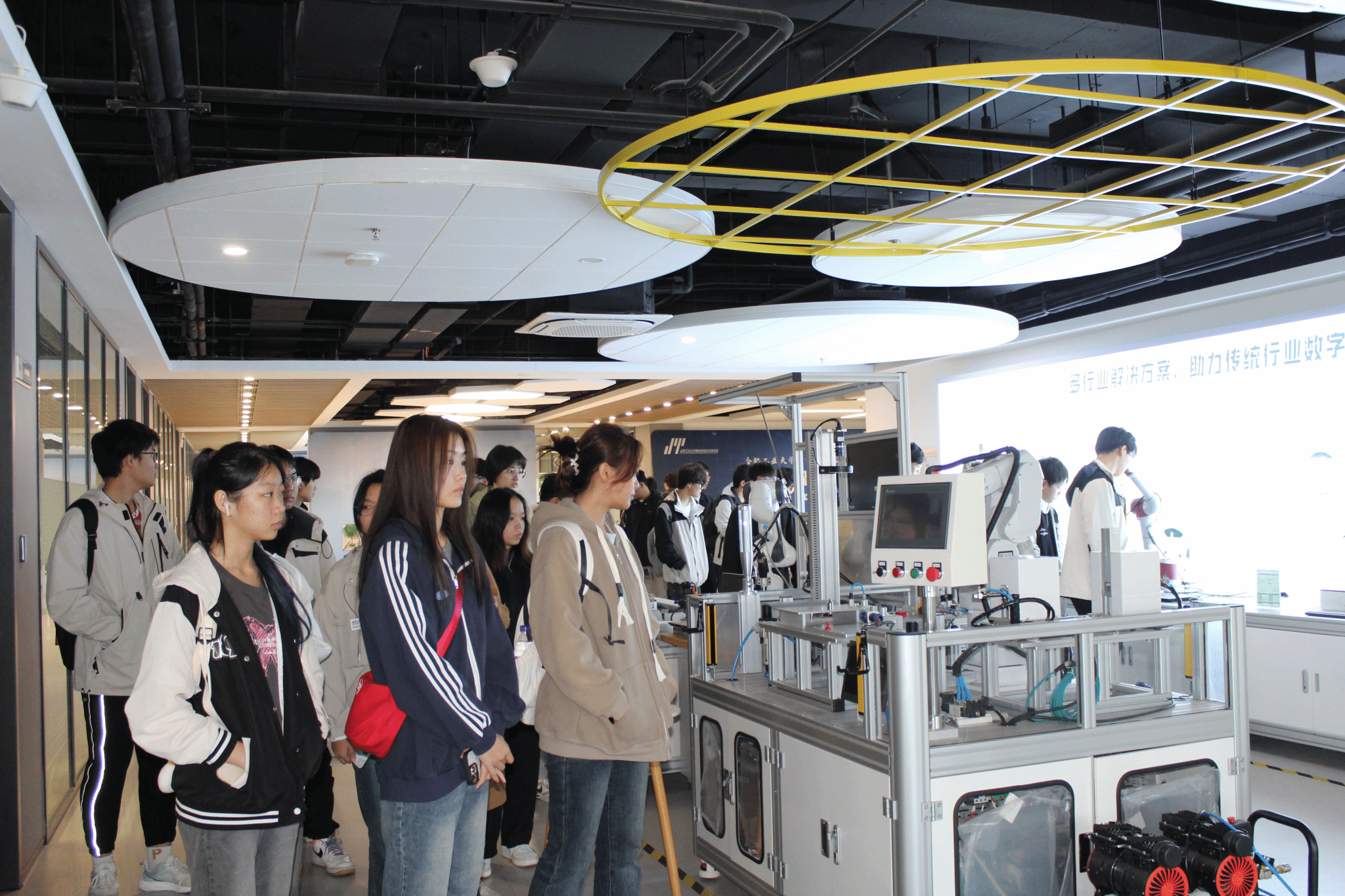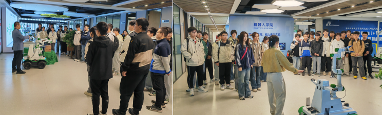 合肥工业大学智能制造研究院是国内领先的智能制造领域研究机构,拥有一支高水平的科研团队和先进的研发设备。在中科深谷集团副总裁蒋荣慰以及多名企业老师的引领下,同学们深入了解了研究院的研究方向、项目成果以及与企业合作的情况。参观过程中,同学们踊跃提问,积极参与讨论,充分展现了他们对科技创新和未来发展的浓厚兴趣。